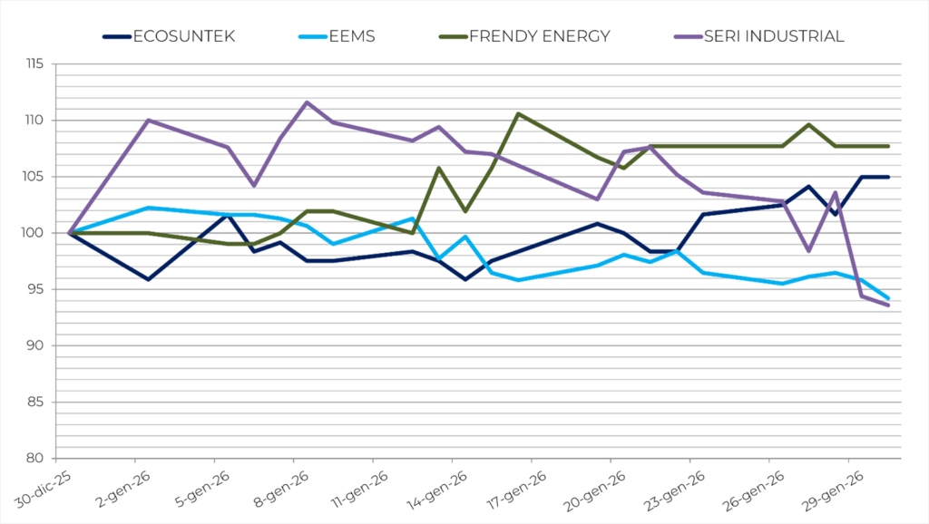 The performance of individual stocks shows a mixed picture, with some positive results in an overall weak context. Among the best performers are Frendy Energy (+7.7%), supported by improved sentiment in the small-scale hydroelectric segment; Ecosuntek (+5.0%), benefiting from selective buying and renewed interest in the stock; and ESI (+2.4%), favored by more stable operational expectations. On the opposite side, Innovatec (–0.6%) shows substantial stability after previous months’ rebounds, while Alerion (–2.3%) continues to be affected by cooling sentiment in the European wind sector. More pronounced declines are seen for EEMS (–5.8%) and Seri Industrial (–6.4%), penalized by profit-taking and lower risk appetite toward industrial small caps in the sector.
