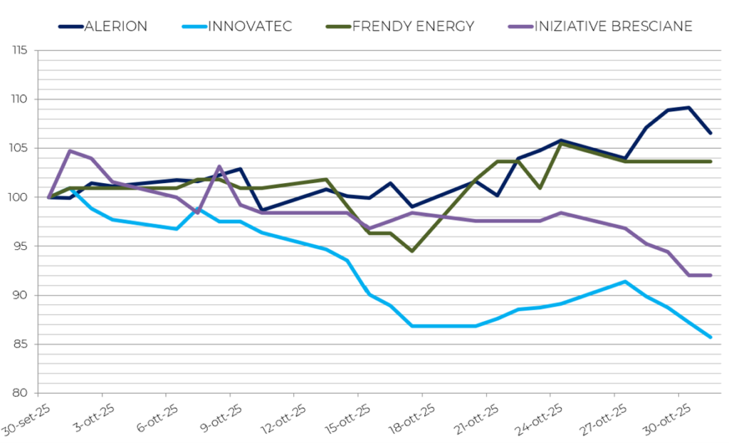Companies in the basket showed mixed but overall positive results. Alerion confirmed itself among the two best-performing stocks of the month (+6.6%), thanks to the strengthening of its wind pipeline and the acquisition of a wind farm in Ireland. Frendy Energy also performed well (+3.7%), benefiting from improved margins in mini-hydroelectric. On the downside, Ecosuntek (-1.8%), Esi (-2.6%), Eems (-3.9%), Seri Industrial (-4.3%), Iniziative Bresciane (-7.9%), and Innovatec (-14.3%). The latter continues its negative phase linked to the revision of its industrial plan and declining operating margins, in a less favorable environmental services market. Overall, the sector closed the month with a positive balance, driven by stocks related to wind power production and storage technologies.