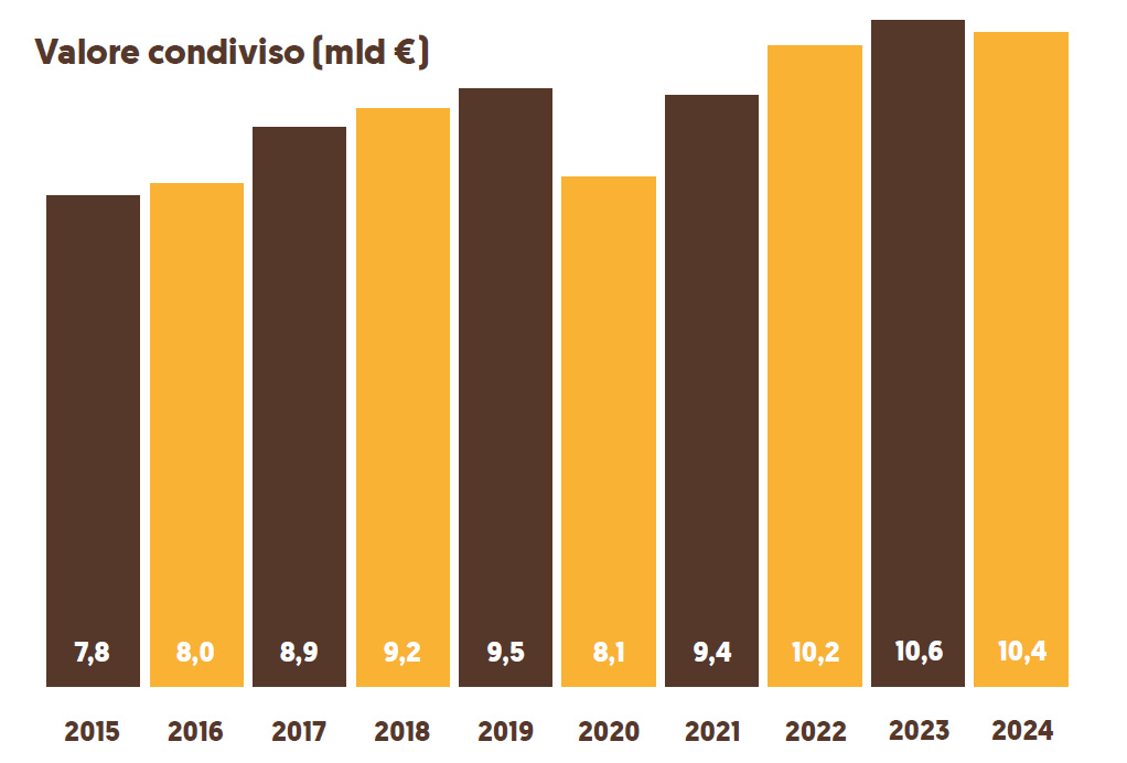 Nel 2024 ha generato 10,4 miliardi di valore condiviso, corrispondenti allo 0,47% del PIL nazionale, di cui il 62% riguarda il settore dell’HORECA. Ad oggi, impiega oltre 111.000 persone con un effetto moltiplicatore occupazionale: ogni addetto alla produzione genera 31 posti di lavoro lungo la filiera.