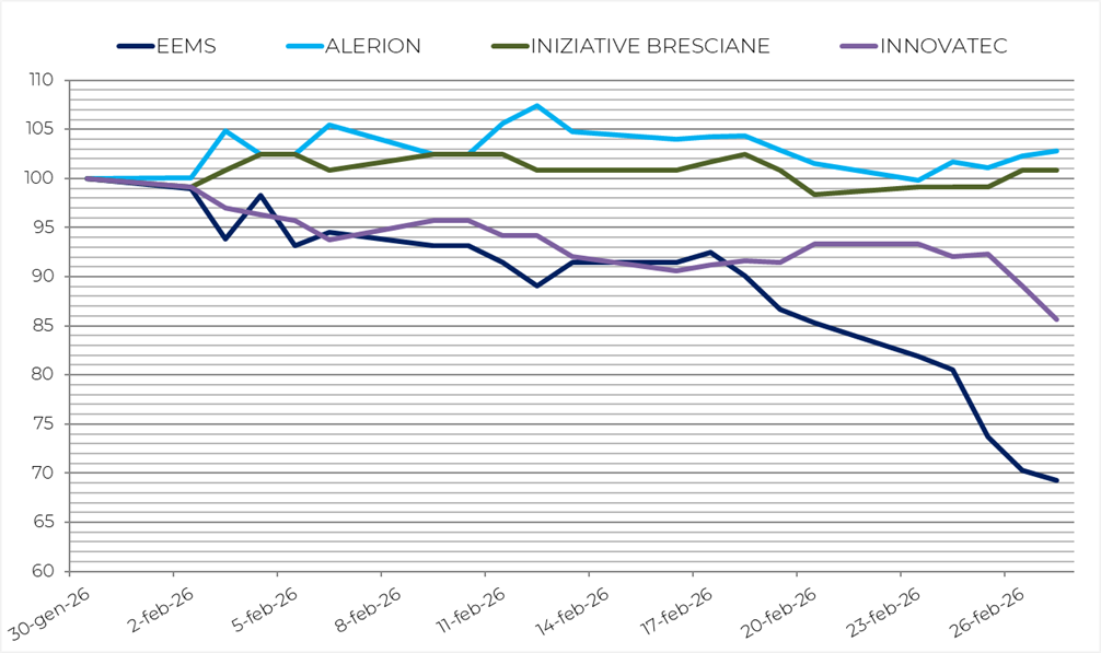 In questo quadro ancora relativamente tranquillo, i singoli titoli mostrano comunque differenze negli andamenti. Tra i migliori si pone Alerion (+2,8%), sostenuta da un miglioramento del sentiment sul comparto eolico europeo e da acquisti selettivi sul titolo. Positiva anche Iniziative Bresciane (+0,8%), che beneficia di una maggiore stabilità delle attese operative. In territorio negativo si posizionano Frendy Energy (–8,0%) ed Ecosuntek (–9,4%), mentre Innovatec (–14,3%) ed Eems (–30,7%) risultano i titoli peggiori del mese, risentendo maggiormente della grande volatilità dei mercati che si innesta nella tendenza non positiva di entrambe nel mese precedente.