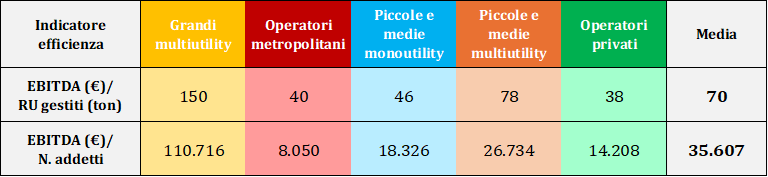 Anche la redditività industriale è molto differenziata. L’indicatore EBITDA/RU gestiti si attesta mediamente sui 70 €/ton (Figura 1b), con valori alti per le Grandi multiutility (150 €/ton) e bassi per gli Operatori privati (38 €/ton) e gli Operatori metropolitani (40 €/ton). In termini di EBITDA/numero dipendenti, la media è di 35.607 €/addetto, passando da 8.050 €/addetto per gli Operatori metropolitani a 110.716 €/addetto per le Grandi multiutility. Il divario, al netto delle possibili differenze nella composizione di business delle multiutility, è molto ampio.