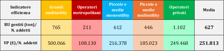 L’efficienza operativa vede un quadro molto articolato tra le diverse categorie di operatori. Il dato, espresso dal rapporto tra rifiuti urbani gestiti e il numero dei dipendenti, spazia dalle 211 ton/addetti per gli Operatori metropolitani alle 1.102 ton/addetti per quelli privati, rispetto a una media di 627 ton/addetti (Figura 1a). L’indicatore del Valore della Produzione rispetto al numero di addetti (VP/N. addetti), invece, va dai 108.130 €/addetti degli Operatori metropolitani ai 500.066 €/addetti delle Grandi multiutility, con una media di 251.813 €/addetti.