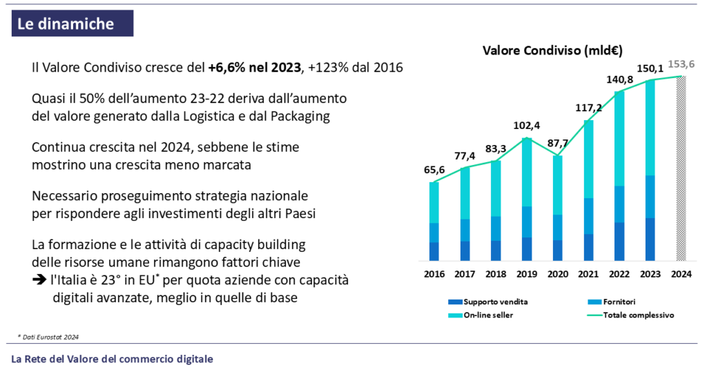 L’e-commerce in Italia ha raggiunto un impatto complessivo di 150 miliardi di euro, pari al 7% del PIL, con una crescita significativa rispetto agli anni precedenti. La filiera contribuisce al sistema fiscale con 44 miliardi di euro, confermando il ruolo strategico del digitale per la spesa pubblica. L’occupazione è in aumento: 1,8 milioni di lavoratori coinvolti e oltre 40 miliardi di salari lordi generati. La catena del valore è ampia e interconnessa, con online seller, fornitori e logistica che producono benefici diffusi. Dal lato dei consumatori, quasi la metà degli italiani sopra i 14 anni ha acquistato online nel 2024, attratti da convenienza e trasparenza. Infine, il settore si distingue per la spinta verso la sostenibilità, grazie a logistica green e packaging riutilizzabile in linea con gli obiettivi europei.